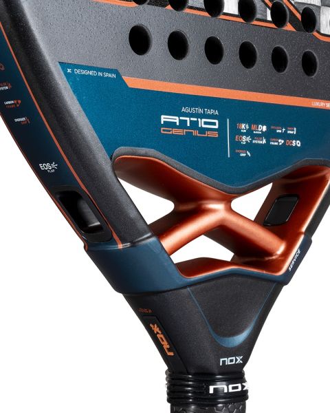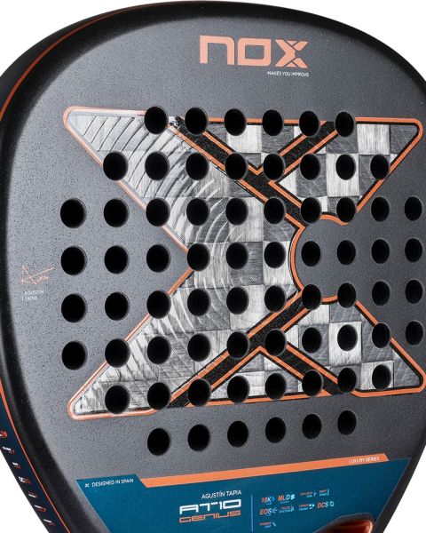 🔥 Domina la pista con la pala más potente de la Luxury Series 2025. La Nox AT10 Genius Attack 18K Alum, diseñada en colaboración con Agustín Tapia, está pensada para jugadores avanzados y profesionales que buscan un golpe agresivo, firme y preciso. Su elegante diseño en negro, azul y bronce refleja su carácter imponente y sofisticado.